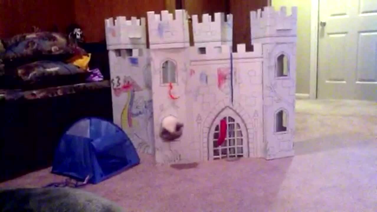 A cat sticks its head through the window of a toy castle and gets stuck. The cat panics and runs around, dragging the entire castle with it.