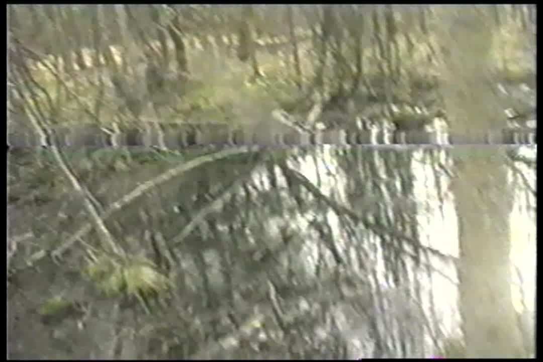 Teen girl tries to jump over a swamp. She jumps and holds onto small tree. The tree falls and she lands on her back in the swamp
