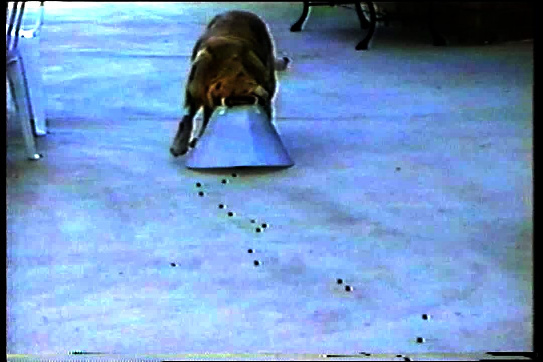 DOG. Funny-looking black dog licks window. Date on screen 1992. Funny face.