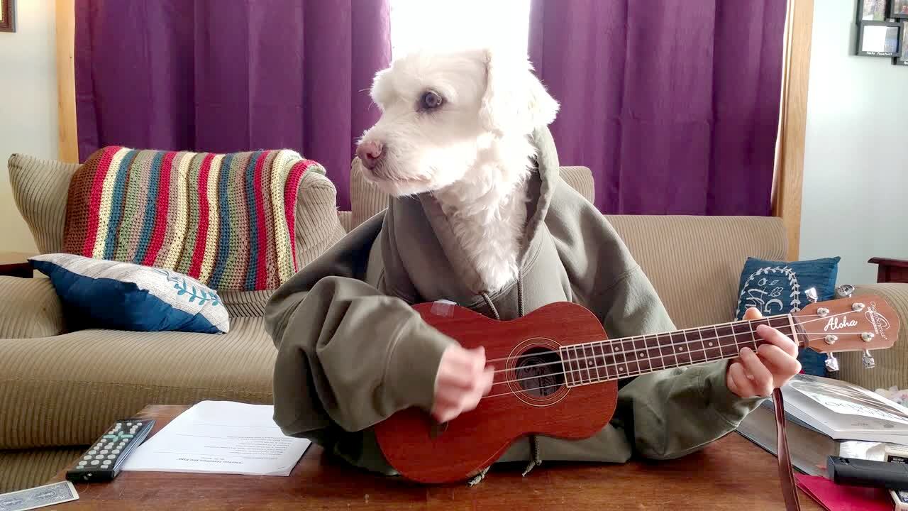 "Husky Howler" - A young boy and girl play guitar and drums. A Husky dog lays in the stairway and howls along with their music.