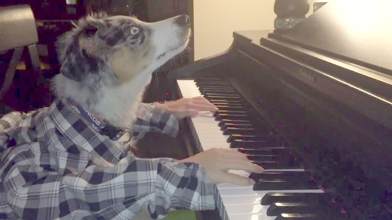 A dog with human hands, wearing a plaid shirt, plays the piano indoors.