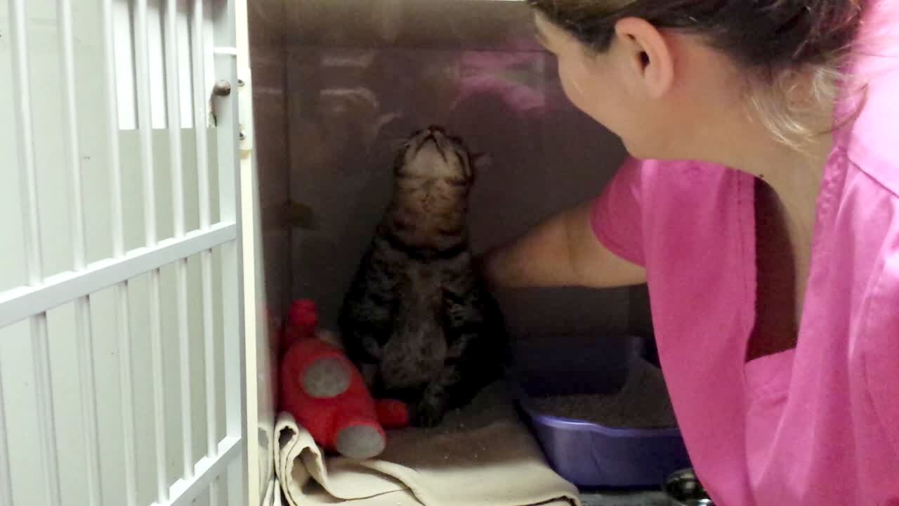 A woman rubs a dog's chest, and each time she stops the dog pulls her hand back and looks at the camera.