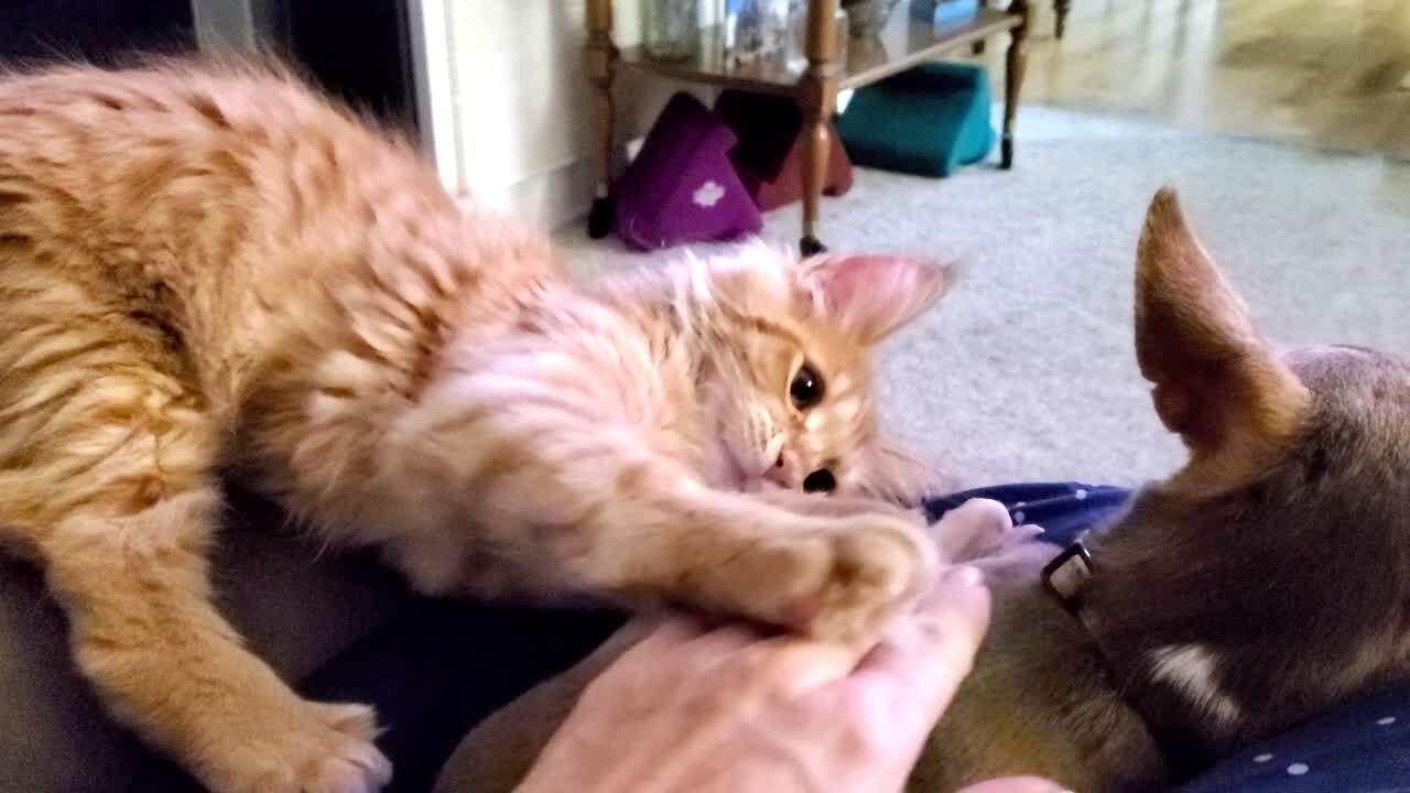 A woman on with the camera on a living room couch pets a chihuahua dog and a cat copies her and pets the dog and then slips backwards and falls off the couch.