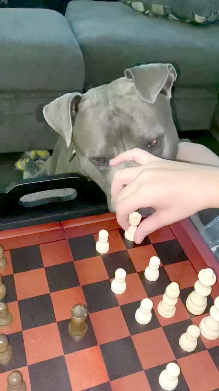 A dog knocks over a chess piece each time a man sets it up in the living room.