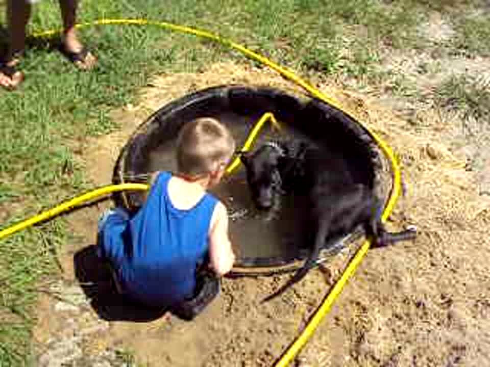Boy tries to fill kiddie pool with hose but dog won't let go of it. They play tug of war. Dog pulls boy into the water.