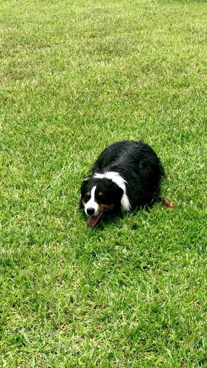 A dog lies down on the grass as a man moves towards it. The dog sits underneath a sprinkler and when it moves, the sprinkler water squirts the man.