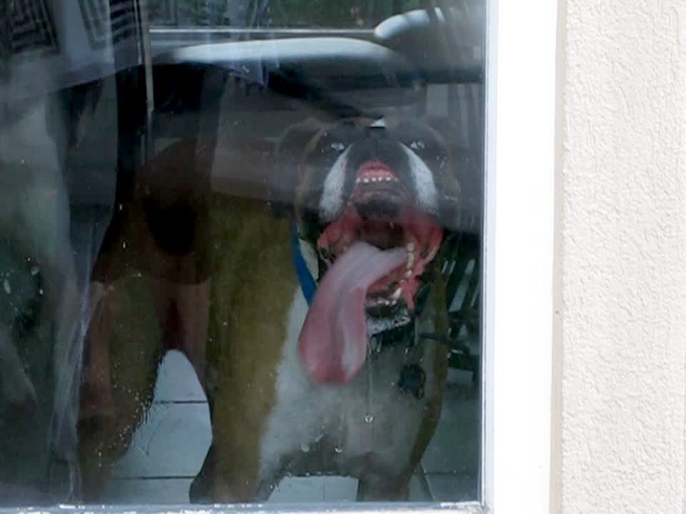 A boxer dog licks a window with an unusually large tongue.