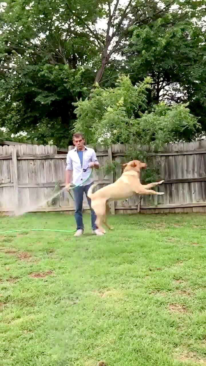 A man waters his yard with a hose and his dog runs back and forth to jump and bite the water.