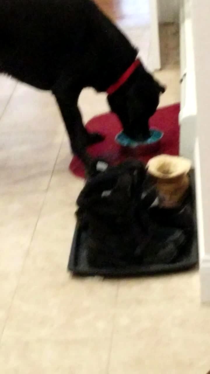Cute large dog catches water drops from leaky roof in her mouth. She swirls her tongue around to catch the water.