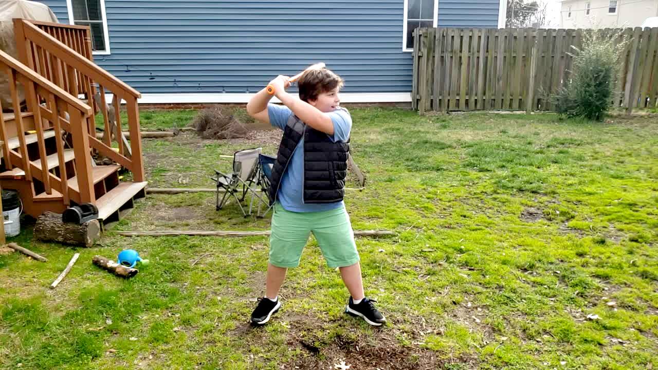A young boy says "Gotta Blast" right before he falls off of a fence.