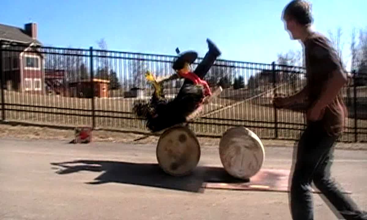 A teen girl lays on top of a wooden cart rolling down the driveway. When she gets to the end, it hits a bump and breaks and she falls to the ground.