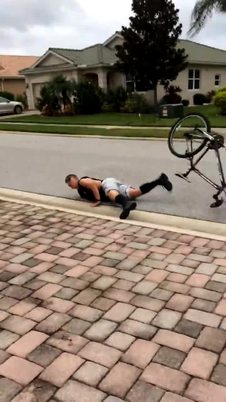 A teen boy rides a bike in the road and then suddenly stops and the bike flips over and he falls off the front.