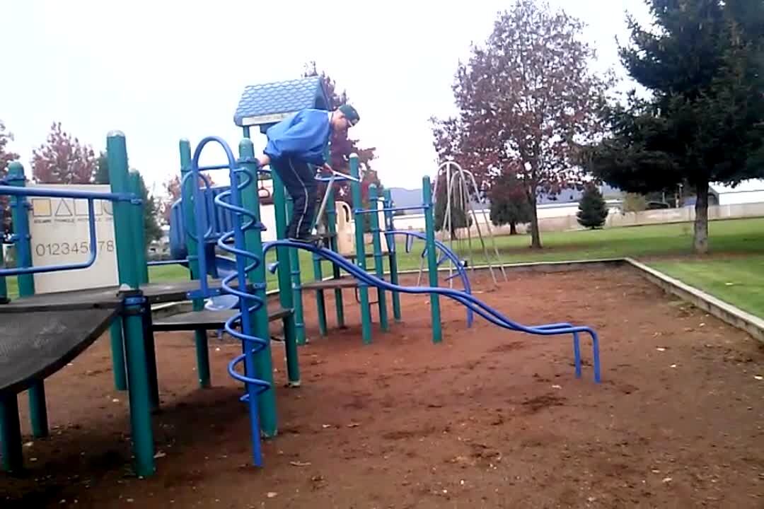 A teenage boy falls and hits his crotch riding a scooter down playground bars. Short tails.