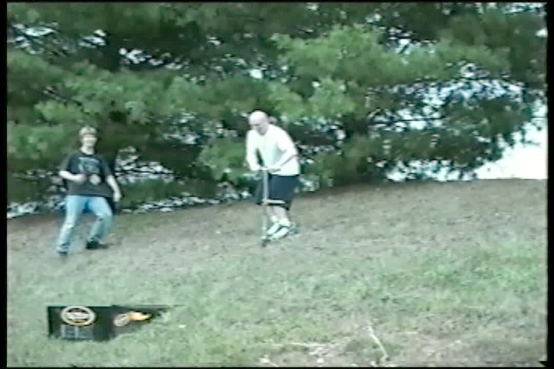 Teen boy falls off a rope swing and slides down a hard rocky hill.