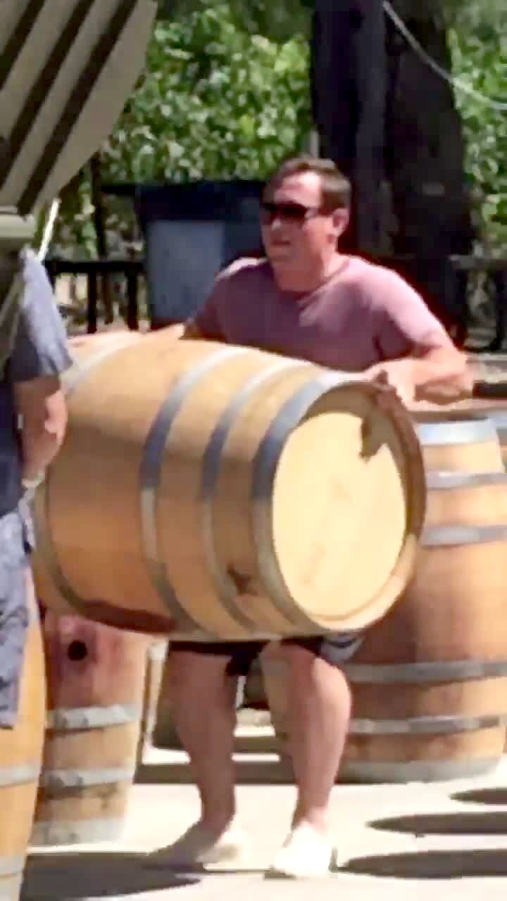 A man lifts a large barrel over his head in a parking lot, but loses balance and falls backwards and drops the barrel on himself.