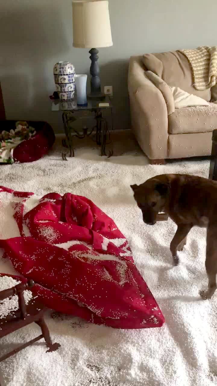 A man bounces on a yoga ball that pops and he falls while his tot boy and girl ride on toy rocking horses.