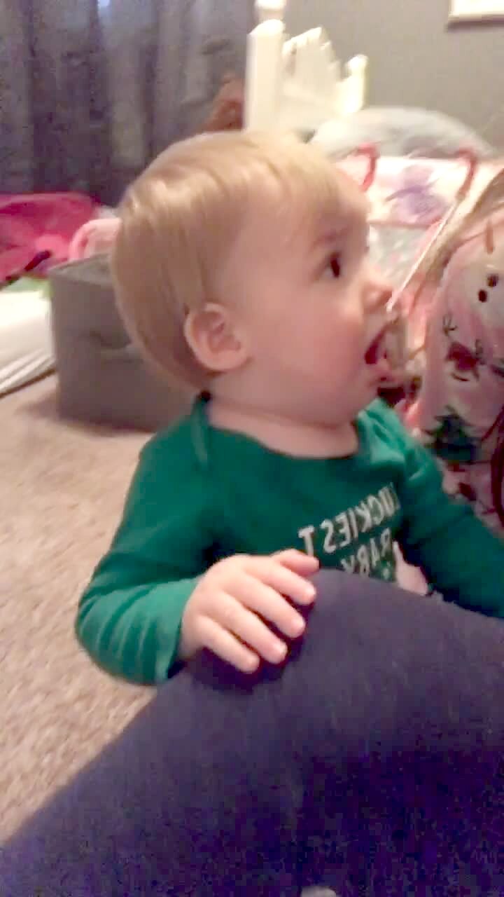A tot boy stands in front of a washer in a room in the house and screams. A woman offscreen says she has the bra. At the end, she gives him the bra and he stops, puts it on his head, and walks away.