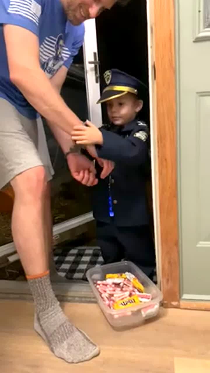 A tot boy says, "I just don't got time for this" while his mother talks about him as he wears his Halloween costume indoors.