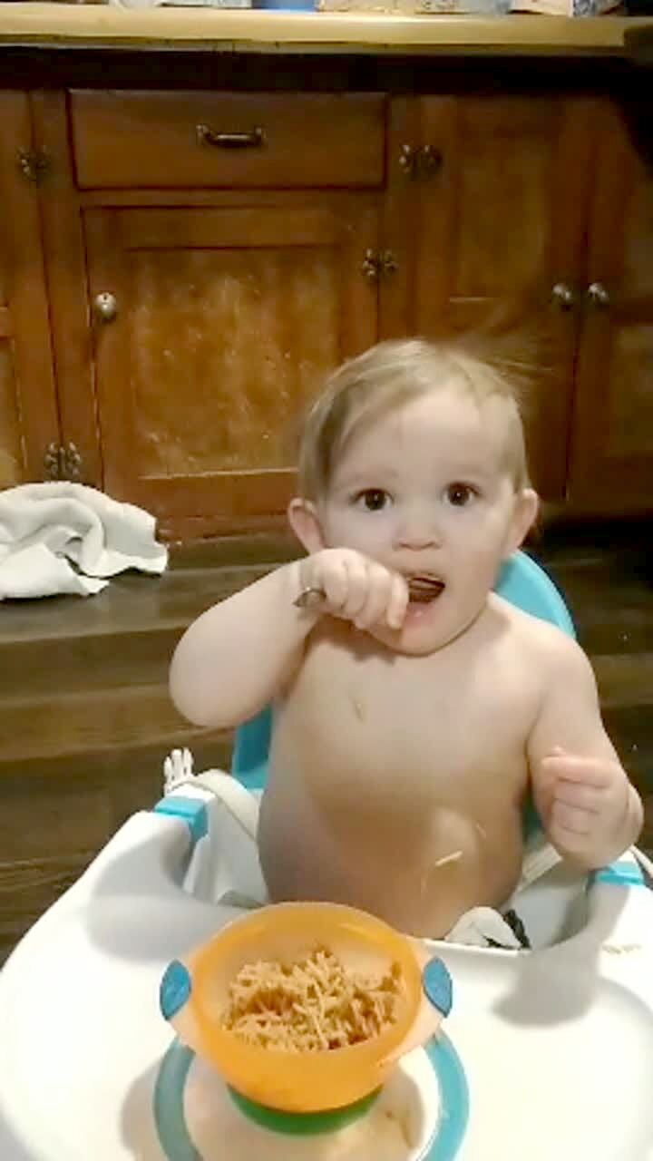 A man films twin baby siblings who eat pasta. The baby girl is all clean and eats her pasta with a fork but the baby boy has a mess everywhere and is eating the food straight from the bowl.