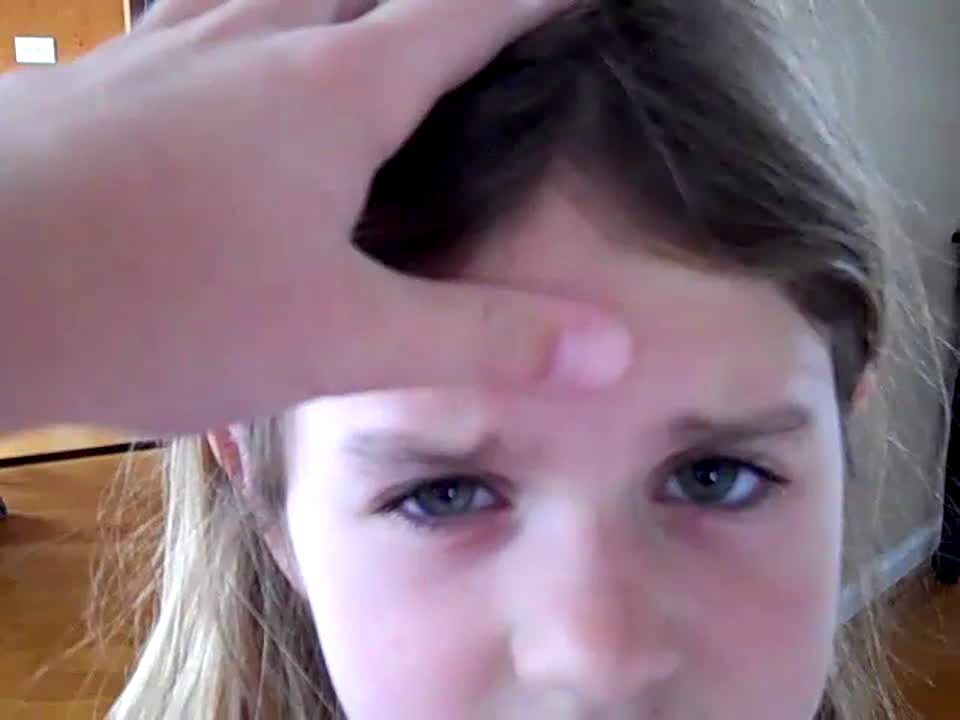 Young girl in pink gets tricked by penny on the forehead practical joke.
