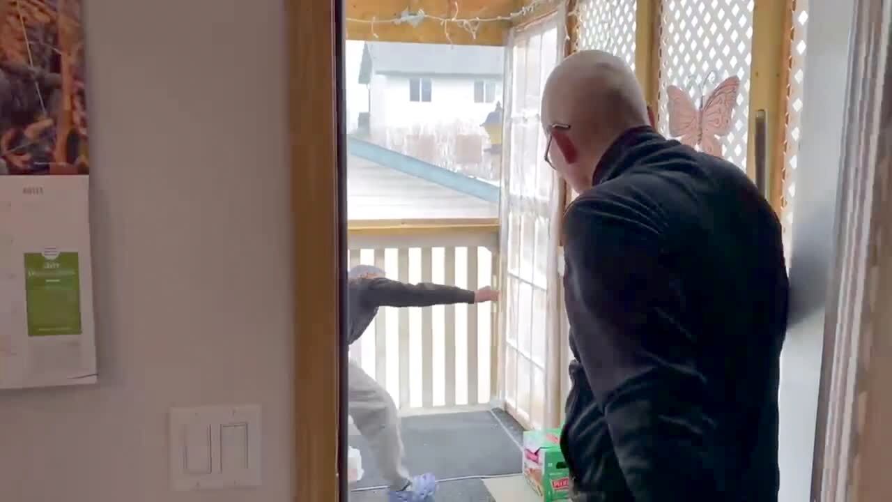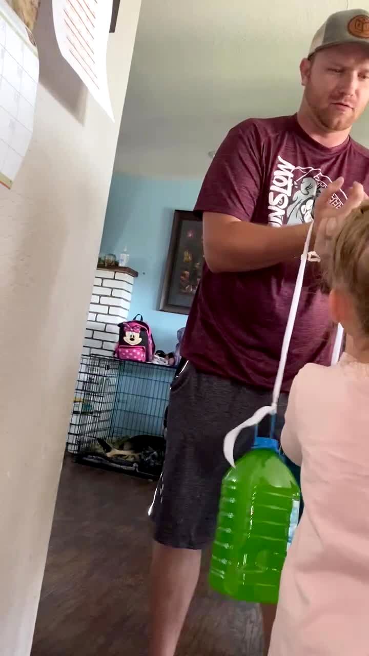 A young girl tells a man in a living room that she needs to test his strength, then she gives him two gallons of juice on a rope, books, and a plate of whipped cream. Then she cuts the rope, and the plate of whipped cream hits the man in the face.