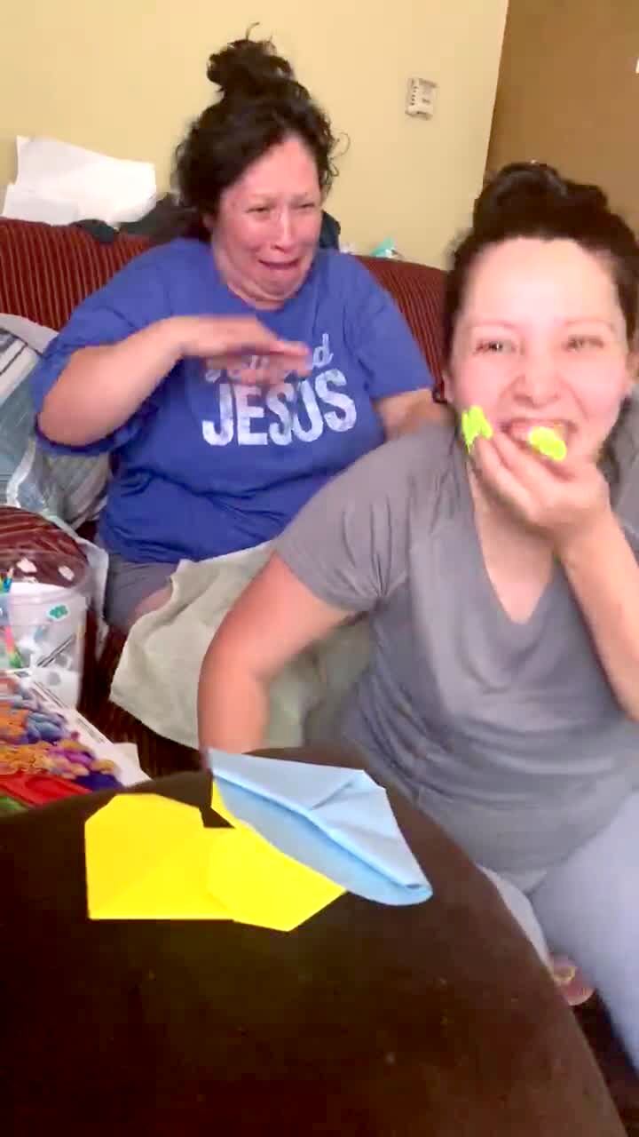 A woman bites a piece of pasta in her mouth when her mother cracks her neck. The woman screams when she thinks she hurt her daughter who rolls on the living room floor and laughs.
