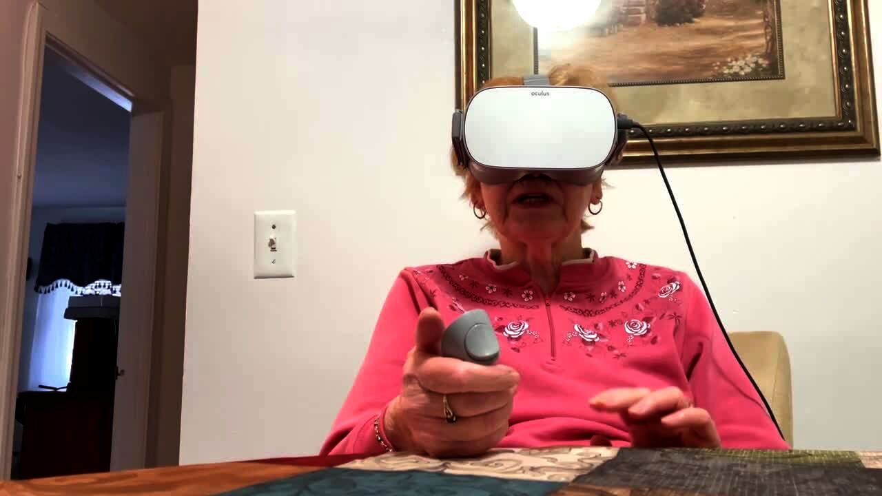 A senior woman with a virtual reality headset watches a video, and another senior woman tickles her with a duster.