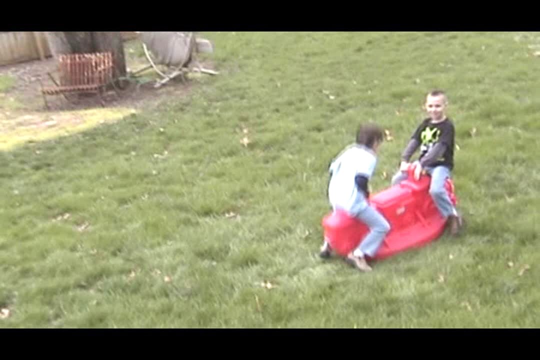 2 boys on see-saw try to go very high. 1 boy almost goes straight up in the air, the other boy falls off & the boy in the air face plants on the ground. Backyard.