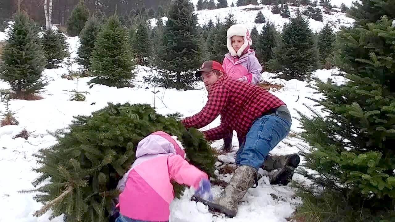 A young girl throws a snowball at her dad, but it slips and goes behind her. She is then hit by a falling Christmas tree that her dad cut down.