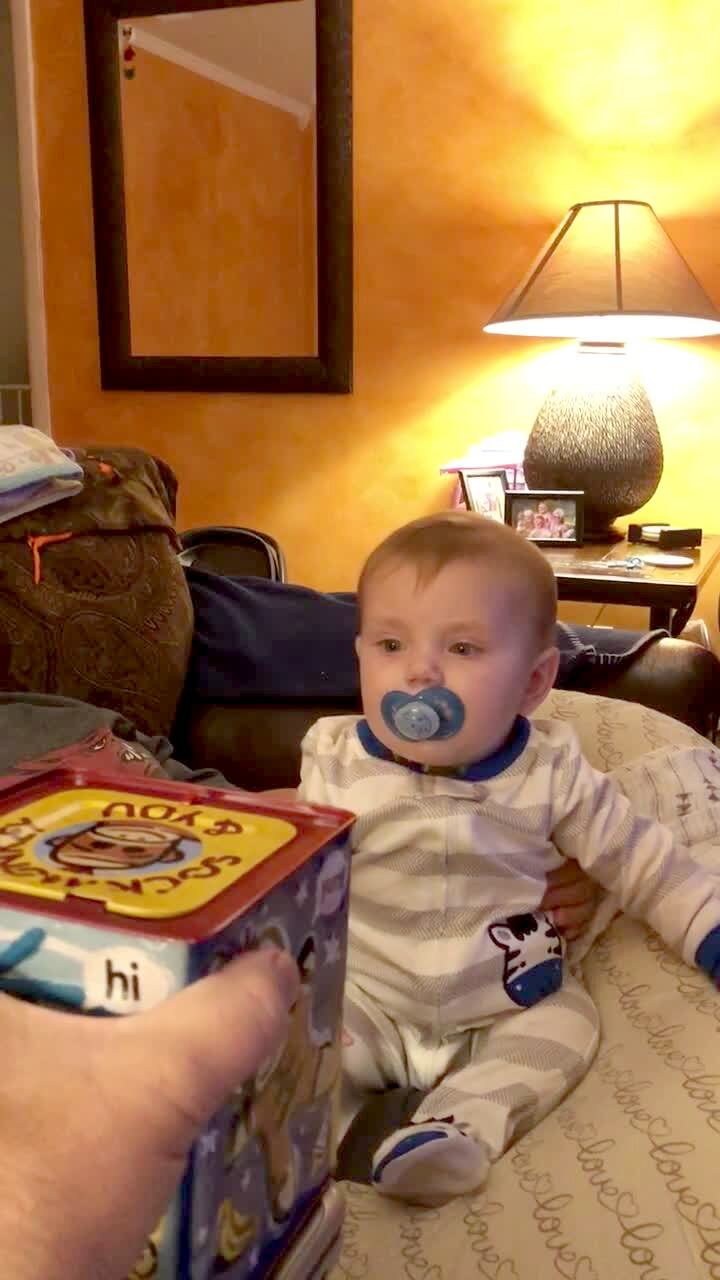 A baby boy sucks on a pacifier in the living room and gets scared when a jack-in-the-box toy pops out in front of him and he drops his pacifier.