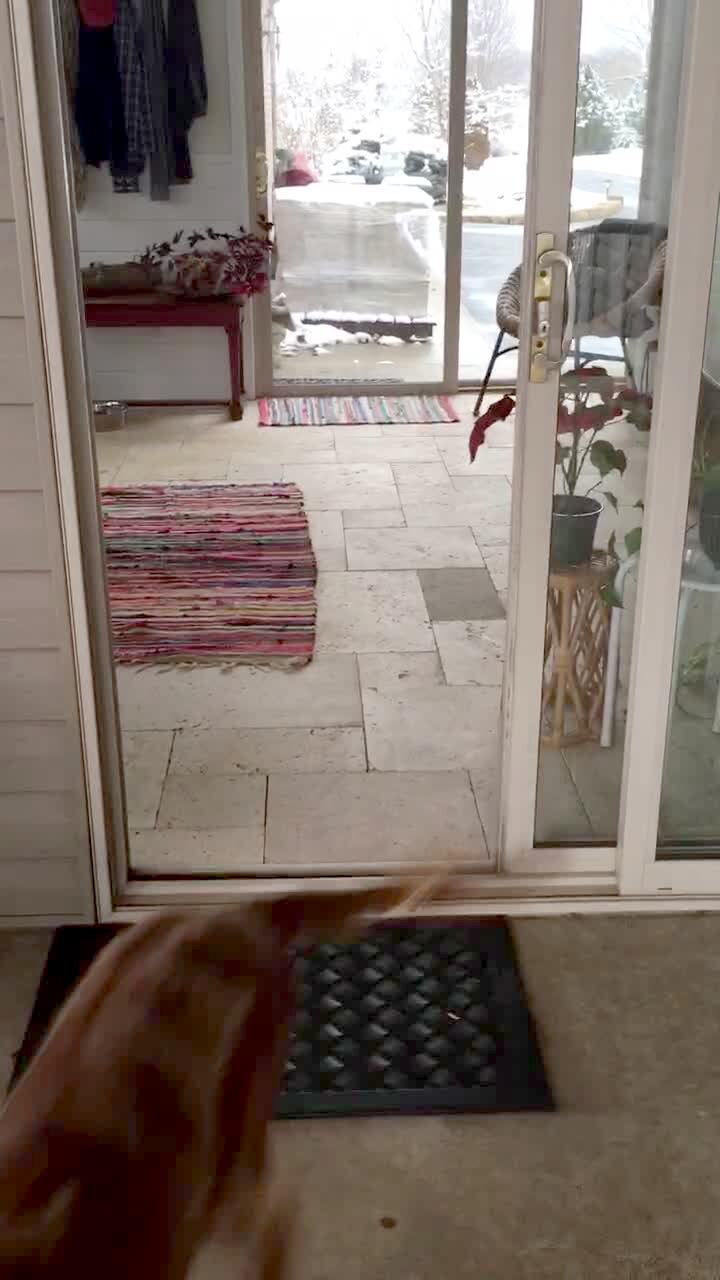 A dog jumps up and down in front of an open door because he doesn't realize he can't walk in.
