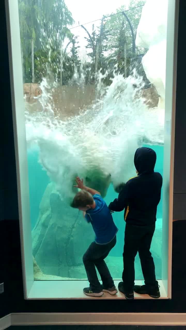 When a polar bear at the zoo jumps towards the glass, a young boy on the other side of the glass gets scared and falls. Featured talent cleared (the two boys standing in front of the glass).