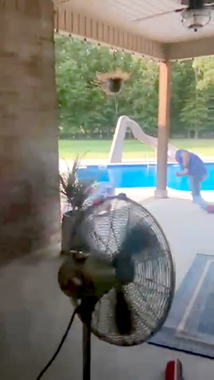 A man tries to get a bat off a wall under a patio outside. The bat flies over the man's head. The man falls. Then the man jumps into the pool to get away from the bat.