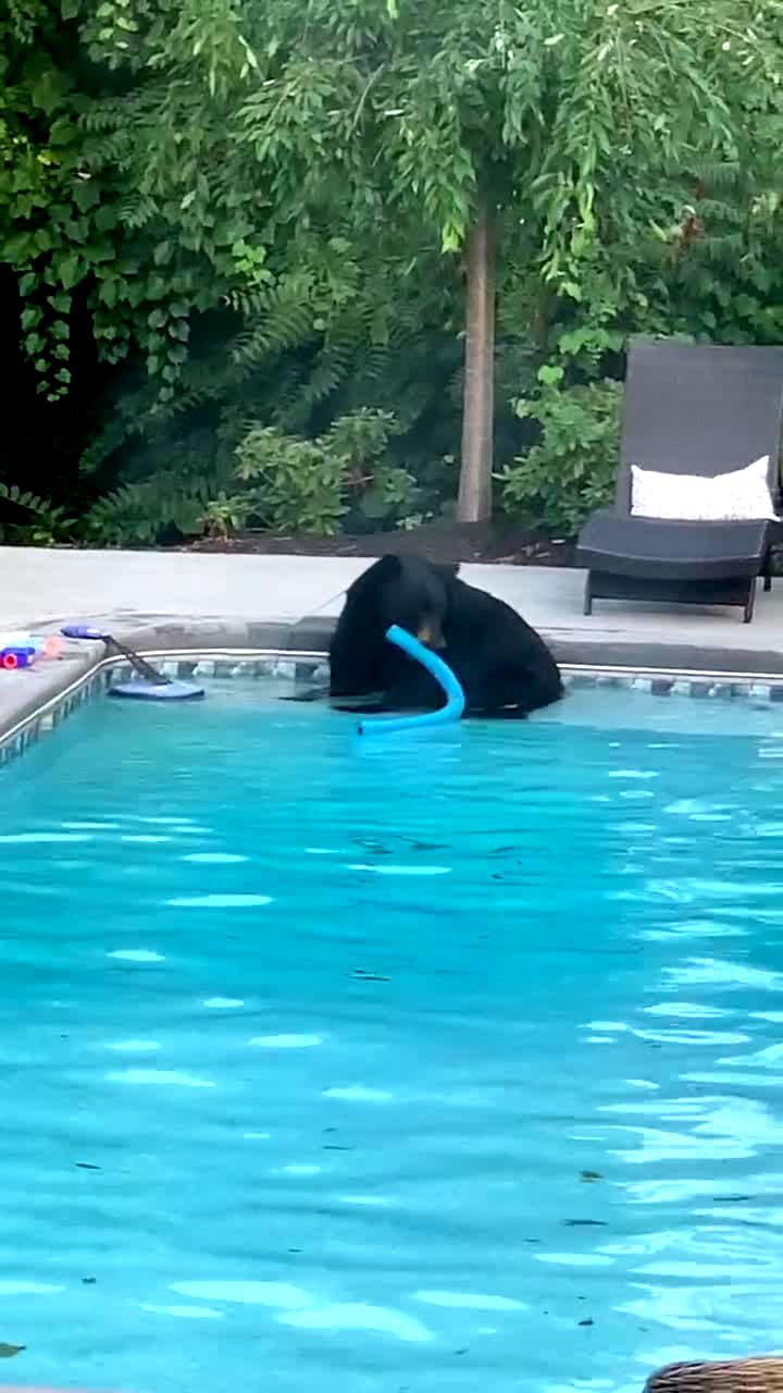 A bear sits inside of a swimming pool then takes a pool noodle out of the pool.