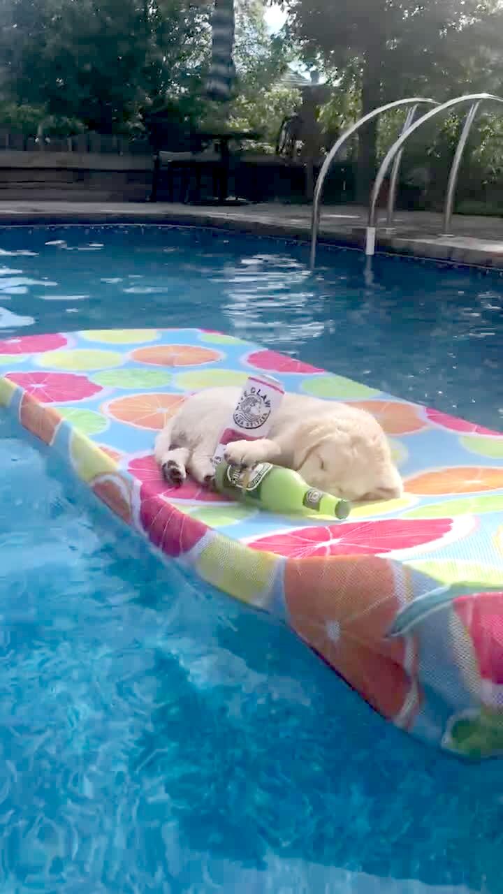 A puppy dog sleeps on a raft in a swimming pool in a yard with two beers on the raft.