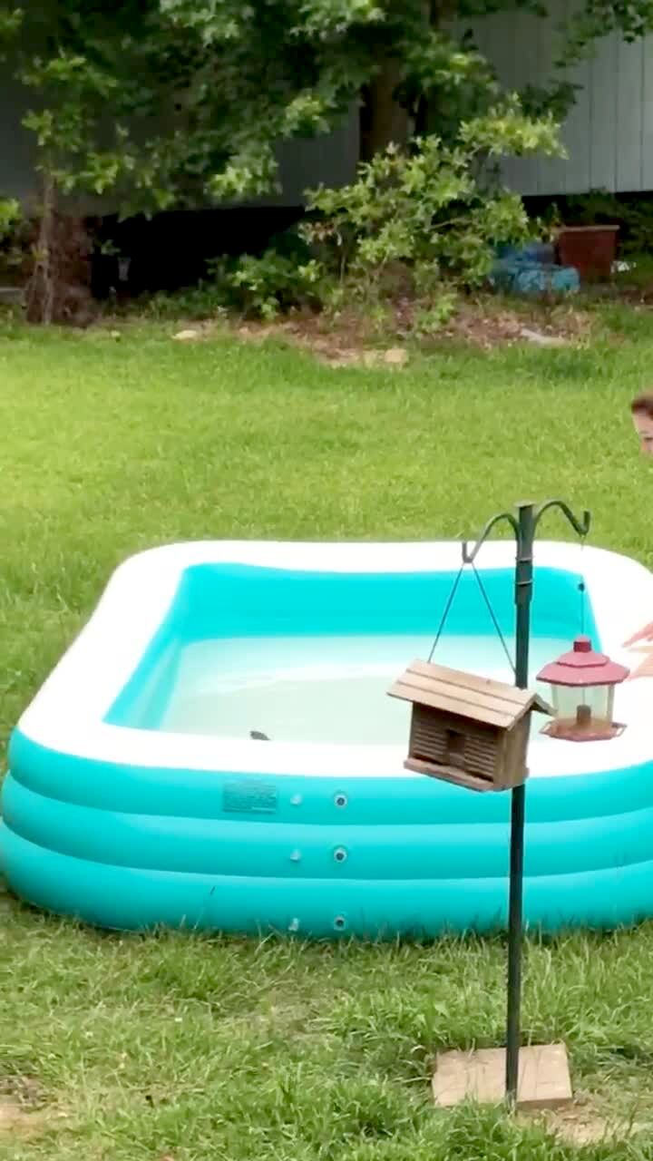 A teen girl in a yard uses a chair to fish a squirrel out of an inflatable kiddie pool. Around 0:50 she lifts it up and it jumps on her and she screams and drops the chair and runs away.