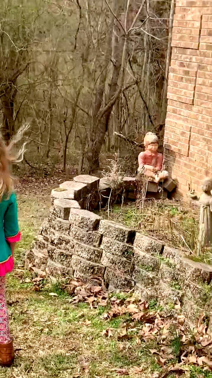 A dog barks at a statue of a young girl in the backyard. A man comes up behind the dog and scares it.