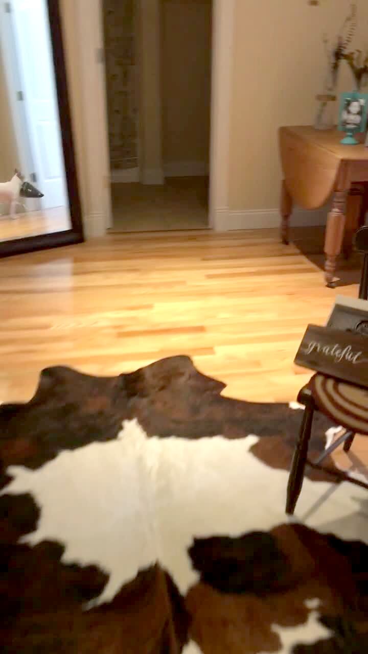 A Chihuahua dog runs circles around a Rottweiler dog in a living room.