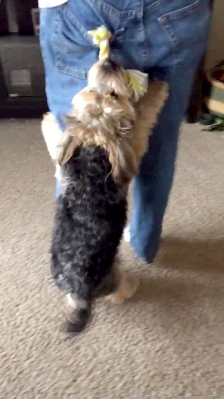 A Yorkshire terrier dog hangs off the ground in the living room while he bites a rope toy in a man's back pocket.