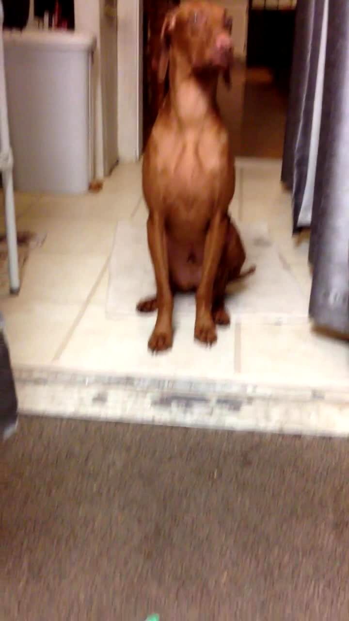 A Pitbull dog whines at a man in the living room. The man asks if the dog wants to go to see Grandma, and the dog sounds back the word "Grandma".