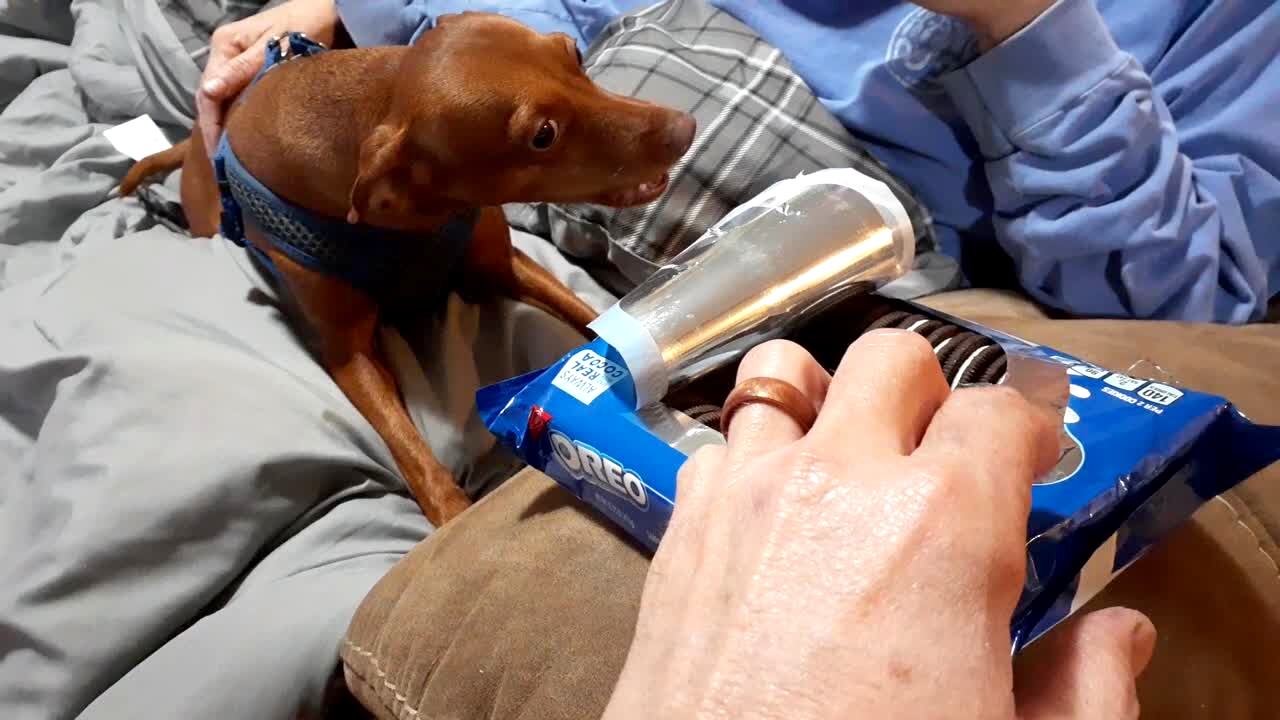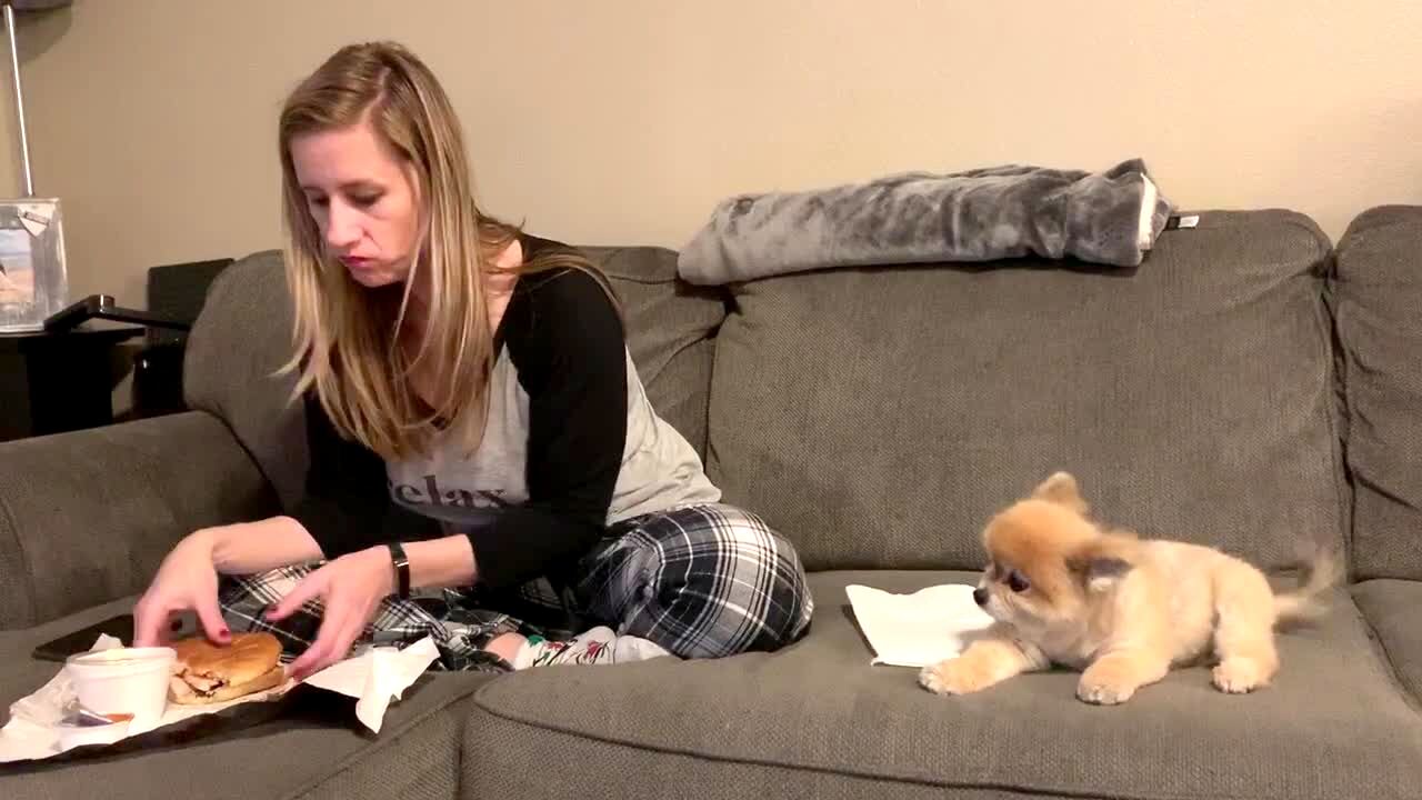 A Chihuahua dog pokes its head out from behind the living room couch and growls at a woman with wide eyes. She asks if it's hungry, and the dog backs away.