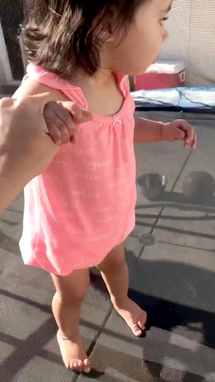 A tot girl stands on a trampoline while a dog walks around and barks underneath. Her older cousin then shouts "you're ruining a family moment!"