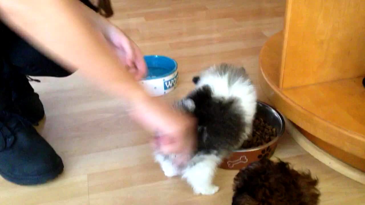 A woman picks up a pomeranian puppy dog in the kitchen as it eats food. The dog growls at her and shows its teeth as she picks it up.