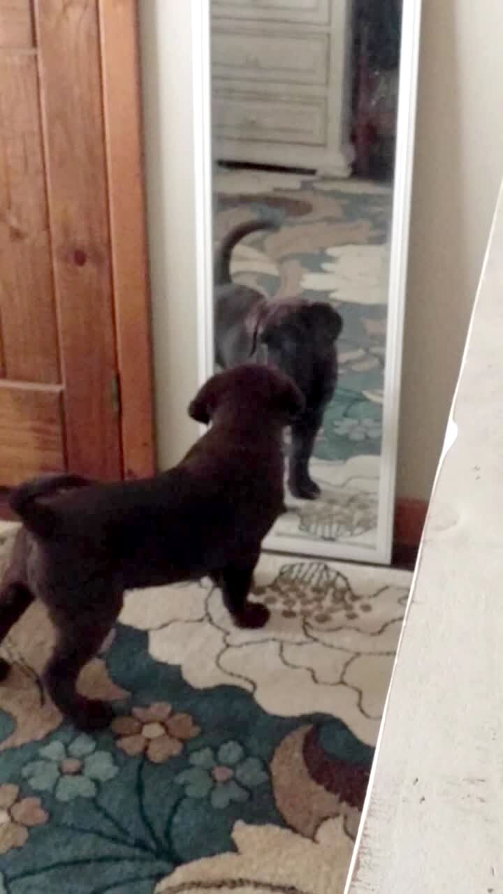 A Labrador puppy dog hides under a bed when a mirror falls in a bedroom after he pushes it with his nose while he barks and growls at his reflection.