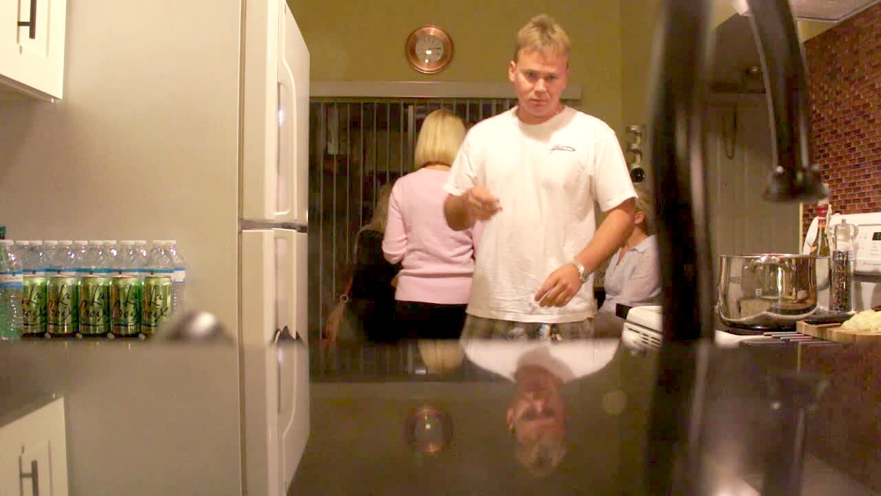 A young brother and sister have flour and chocolate syrup all over themselves and the kitchen floor. The boy runs back and forth and says "it's delicious and nutritious!" and smiles at the camera.