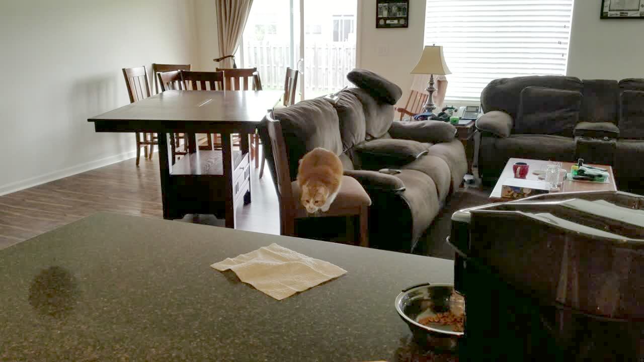 Gray kitten tries to jump from the back of the couch to the kitchen counter, cat hits its face on the counter and falls down.