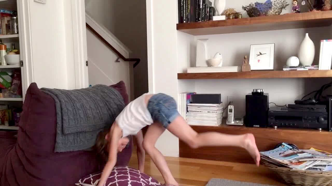 A cat jumps on a young girl's head while the girl practices gymnastics indoors.