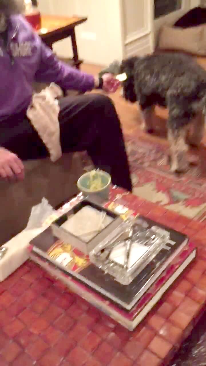 Two kids ride behind an ATV on a sled across a frozen pond. A dog runs in and knocks a kid off the sled.
