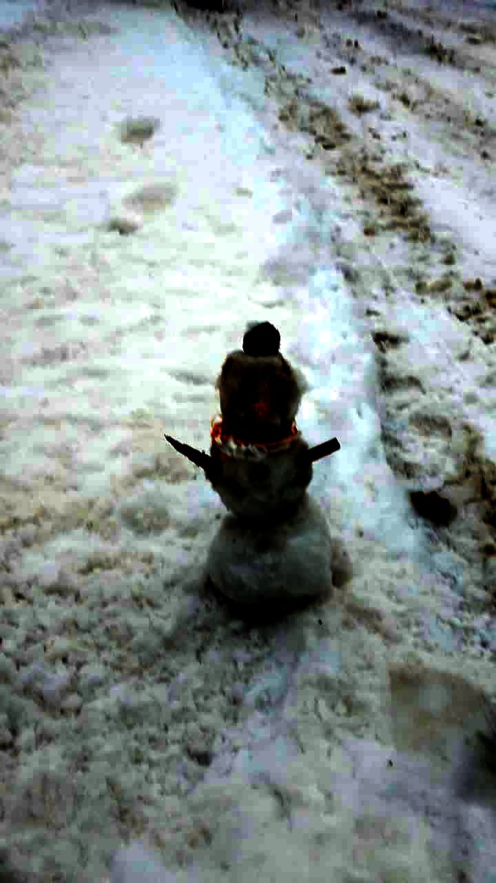 A boy tries to ride down a sled in a back yard standing on his feet. He slips off the sled and crashes into a snowman. On purpose. Short heads. Short tails.