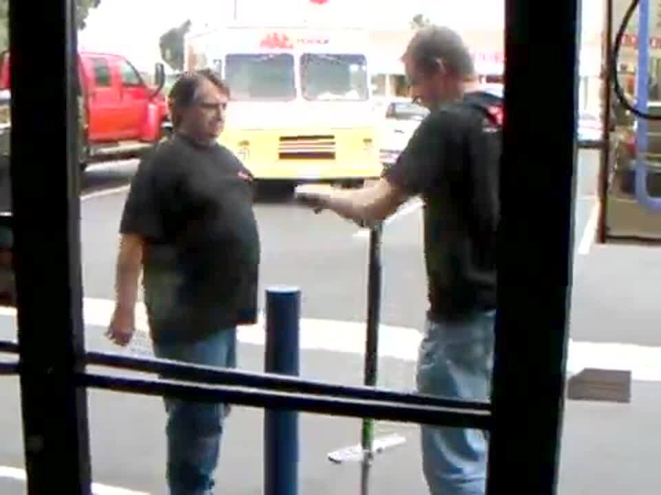 Boy stands in front of glass at zoo with his back to lion, she stalks and charges up to the glass swatting at the boy. When boy turns around he's scared by the lion & jumps back.